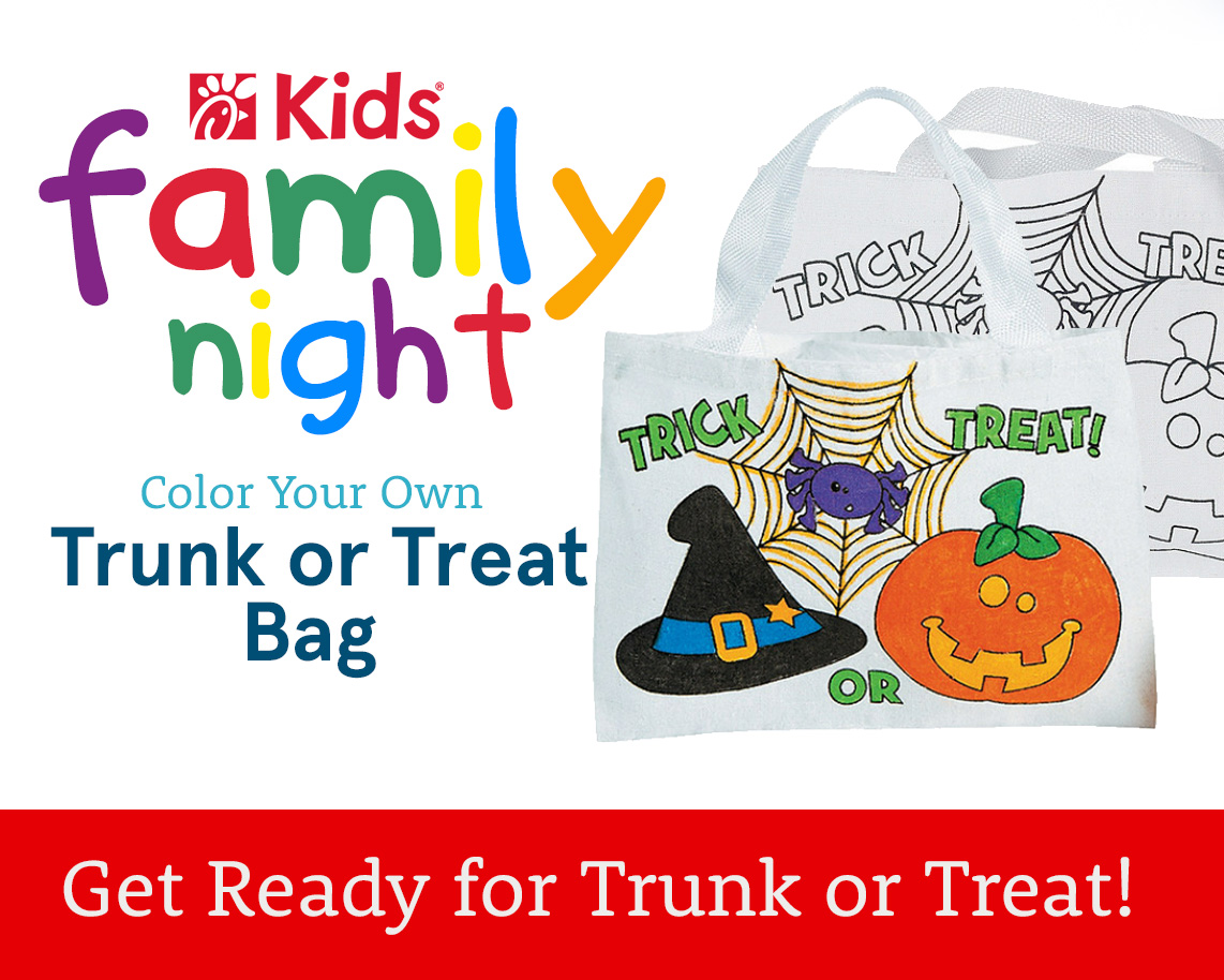 Join us for Family Night at Chick-fil-A Somerton Mondays from 5-8PM! This week, get ready for Chick-fil-A Somerton’s Trunk or Treat by coloring your own bag!